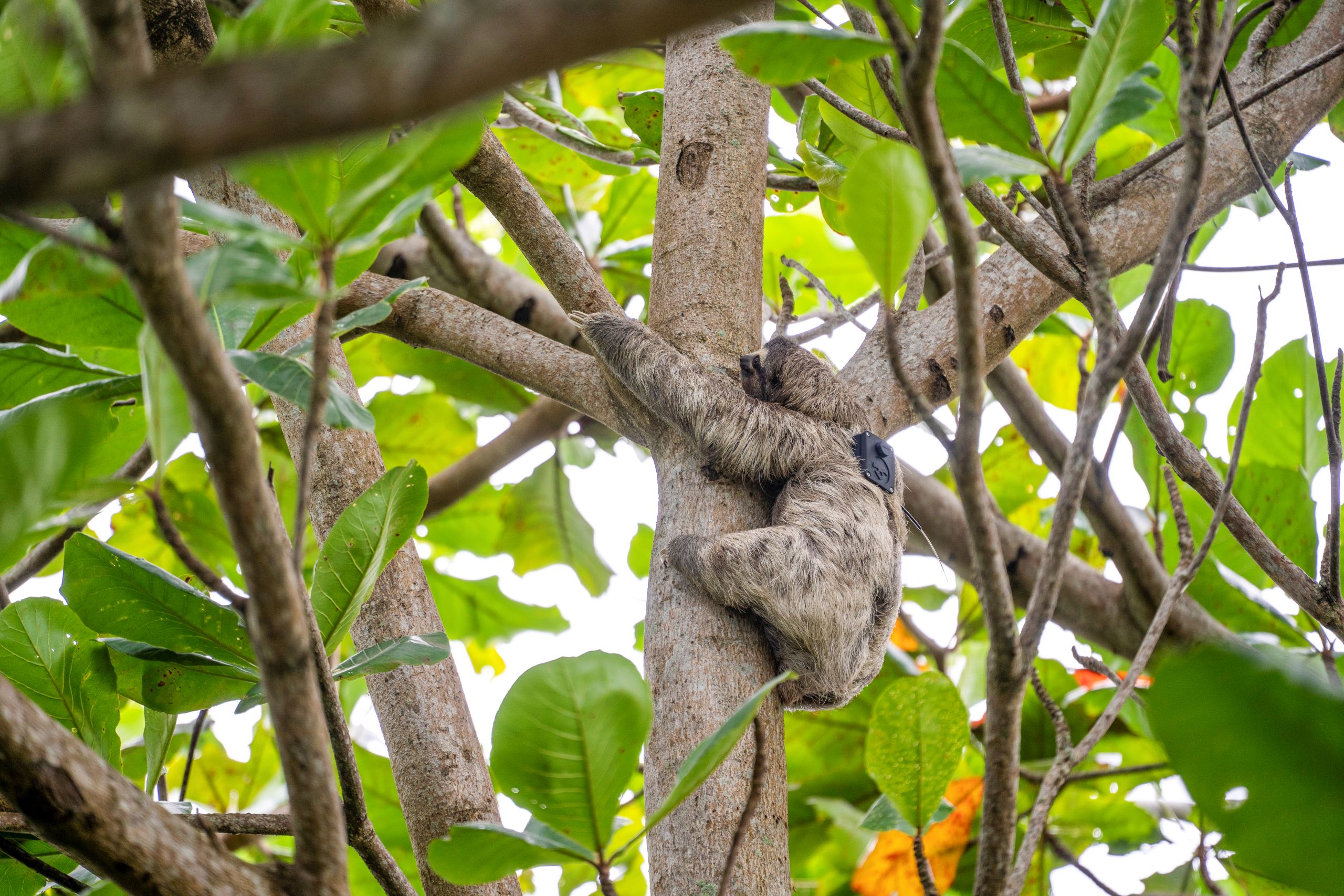 - A wild sloth with a tiny tracking backpack, credits Mira Meijer
