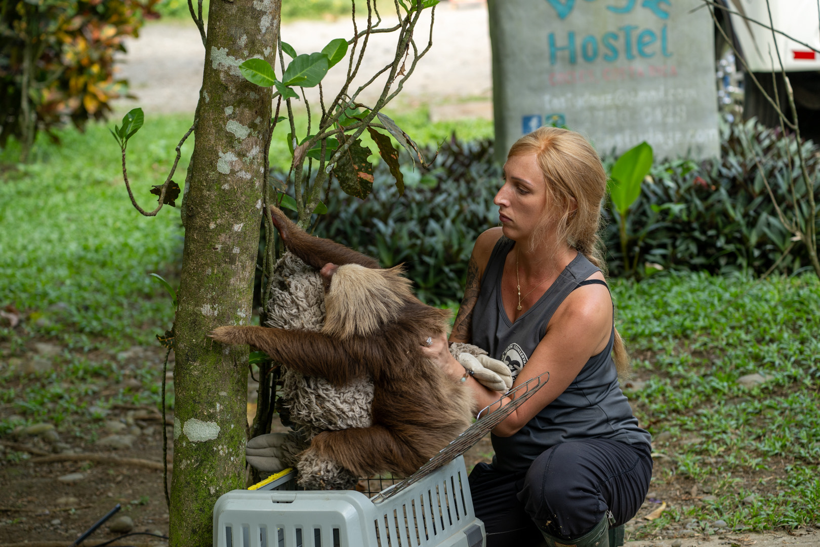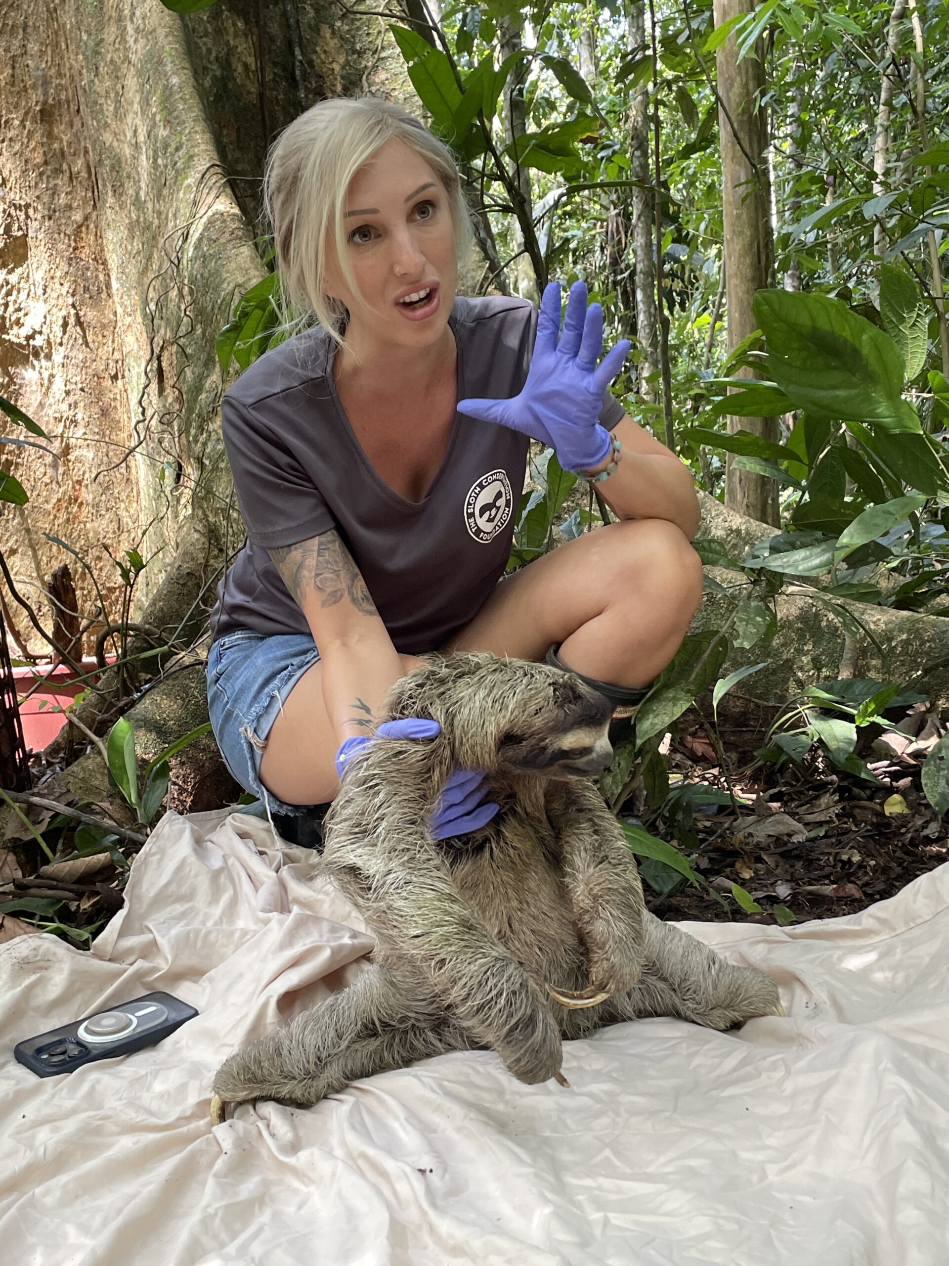 Rebecca Cliffe releasing a brown-throated three-toed sloth wearing a “sloth backpack” tracking device. Credits Suzi Eszterhas