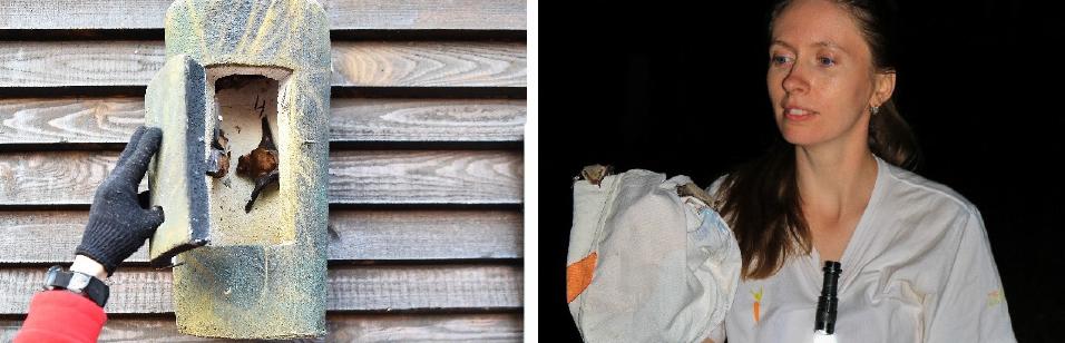 Left: Bat boxes are offered as alternative roosts for the bats. Right: Alona releasing rehabilitated bats.